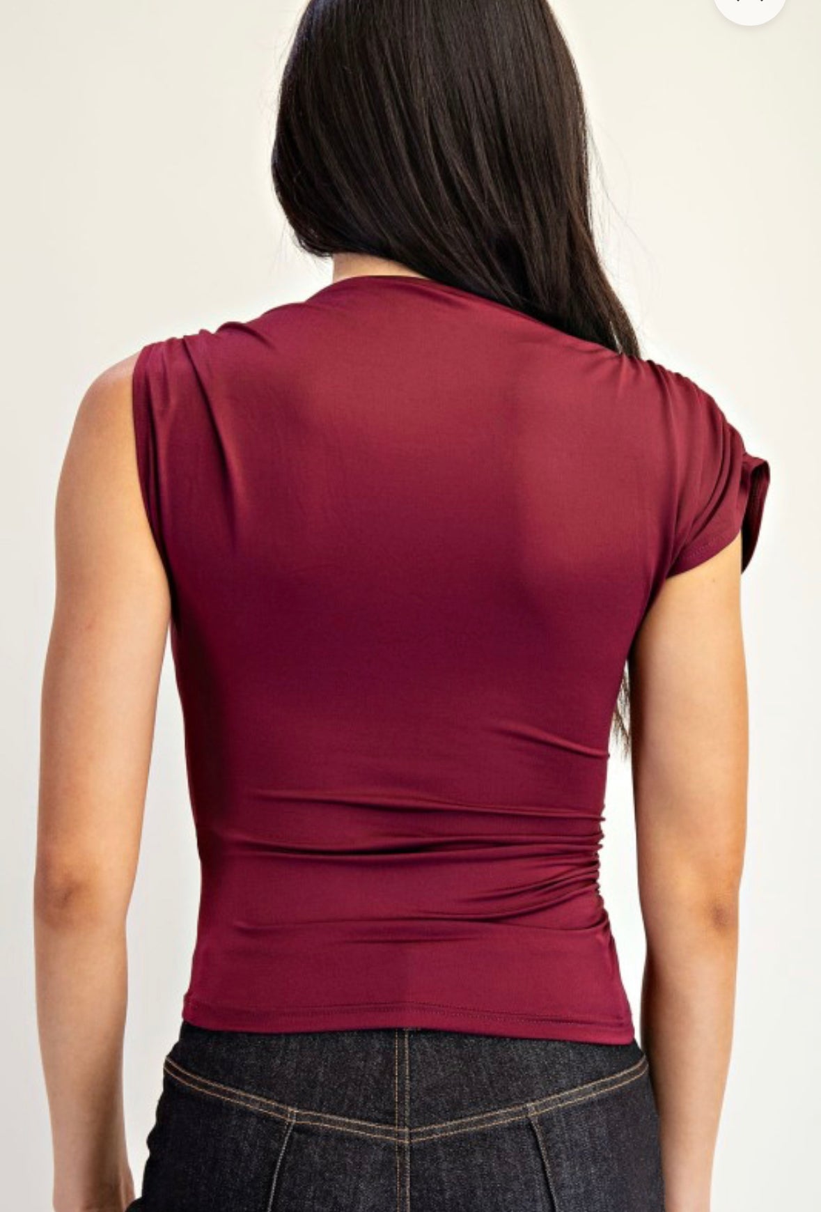 Asymmetric knit top with gold trim. Slight stretch, we recommend sizing up.