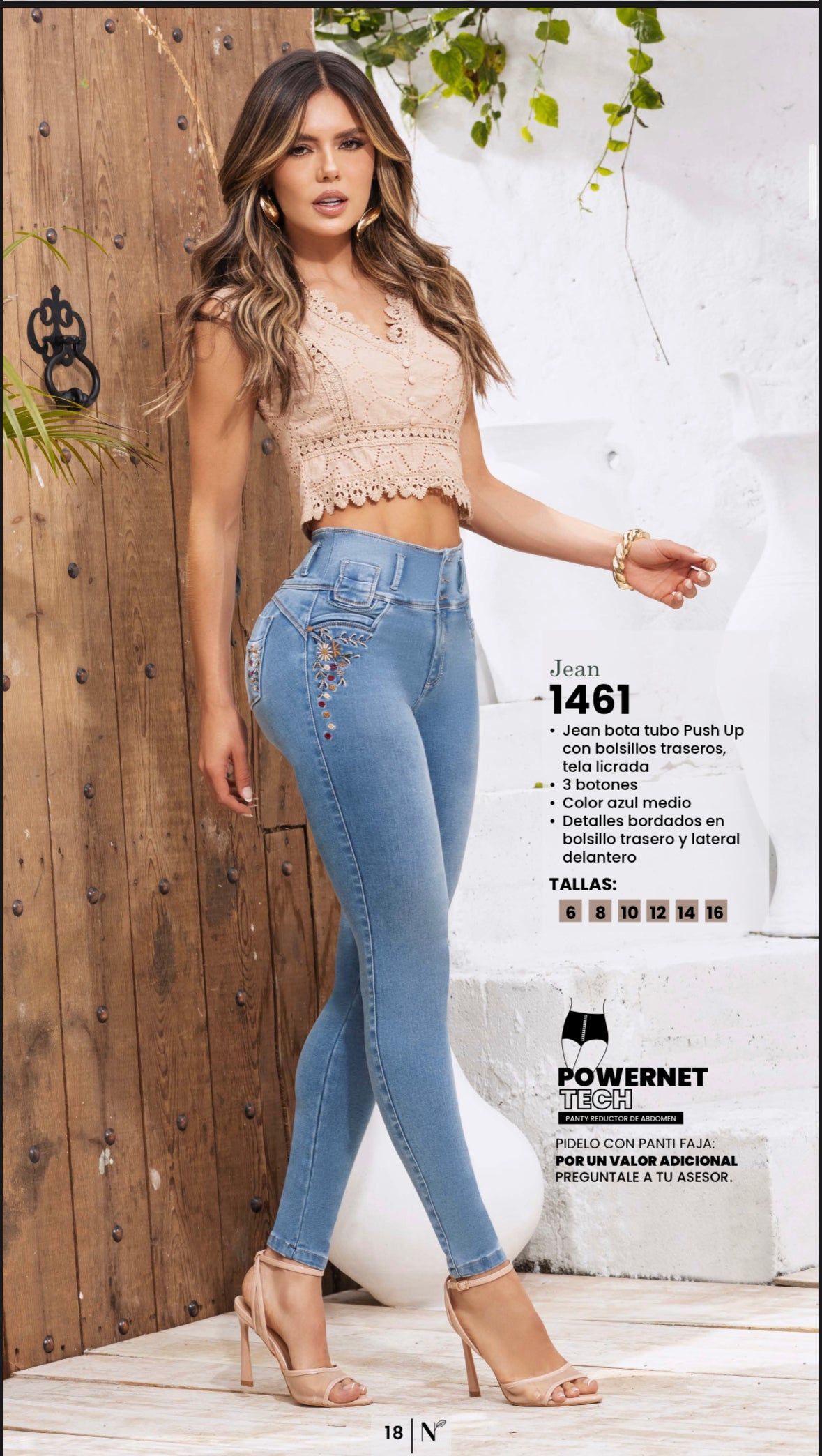 Jean bota tubo push up con bolsillos traseros. Esta referencia tiene 3 botones y es color azul medio. Trae detalles bordados en el bolsillo trasero y lateral delantero.